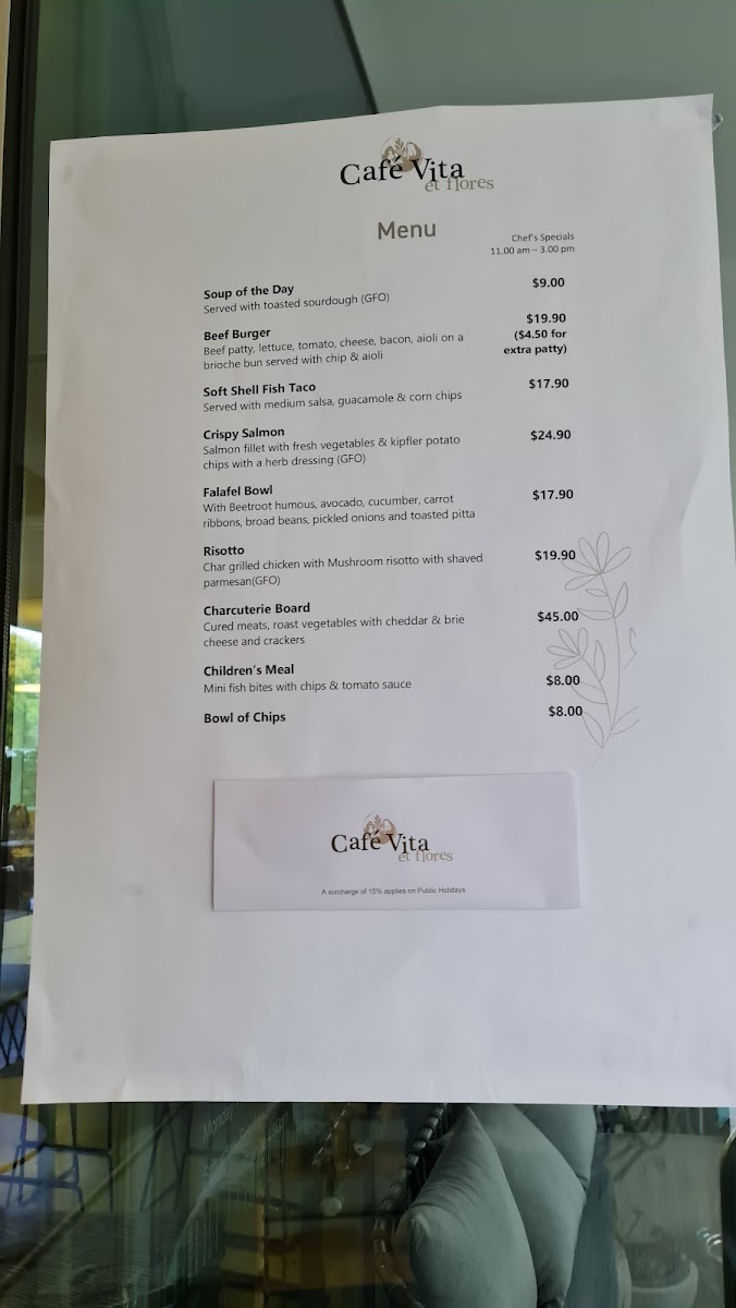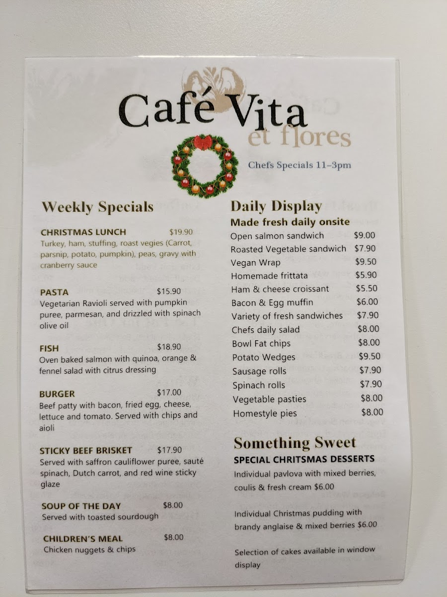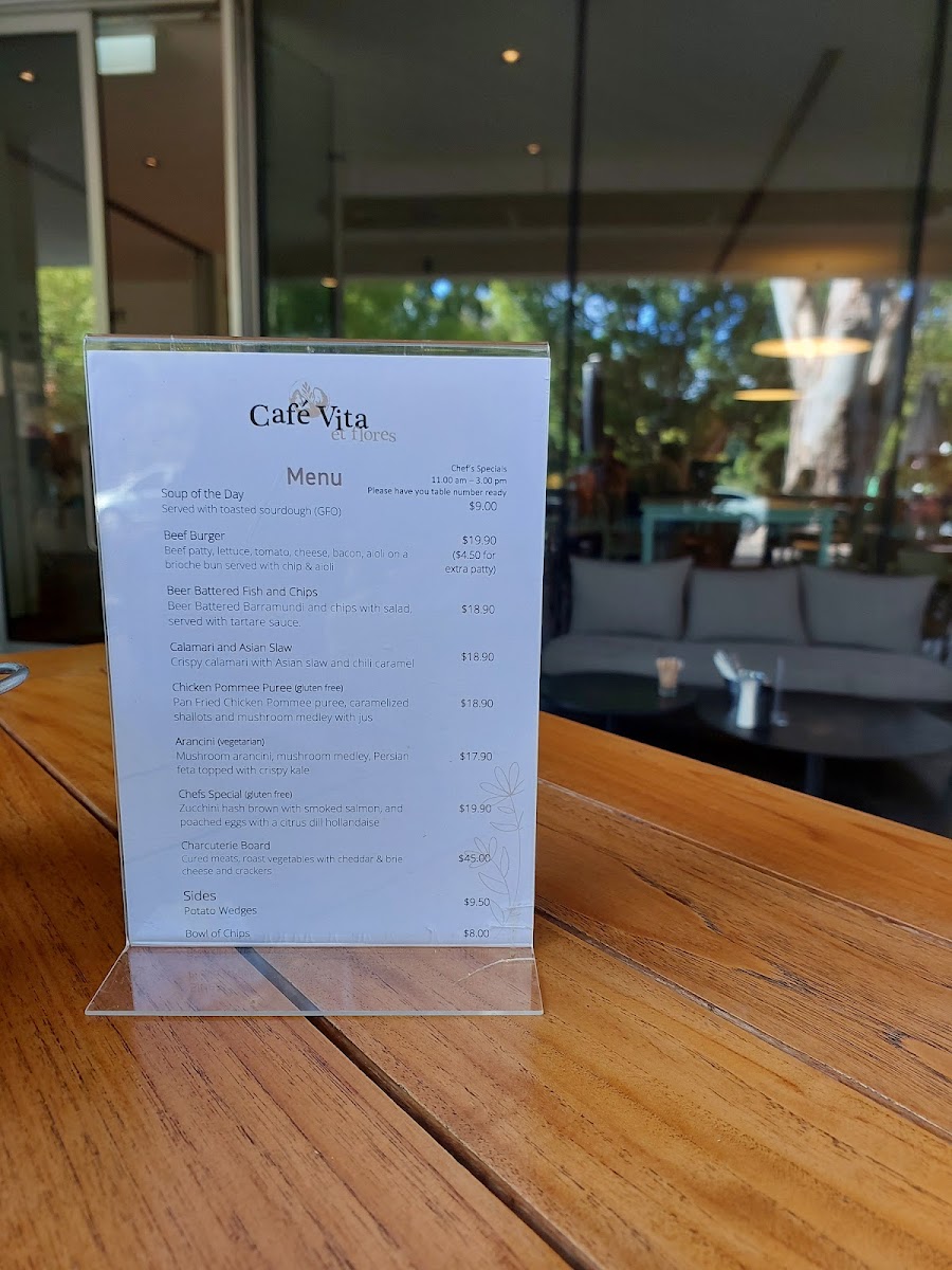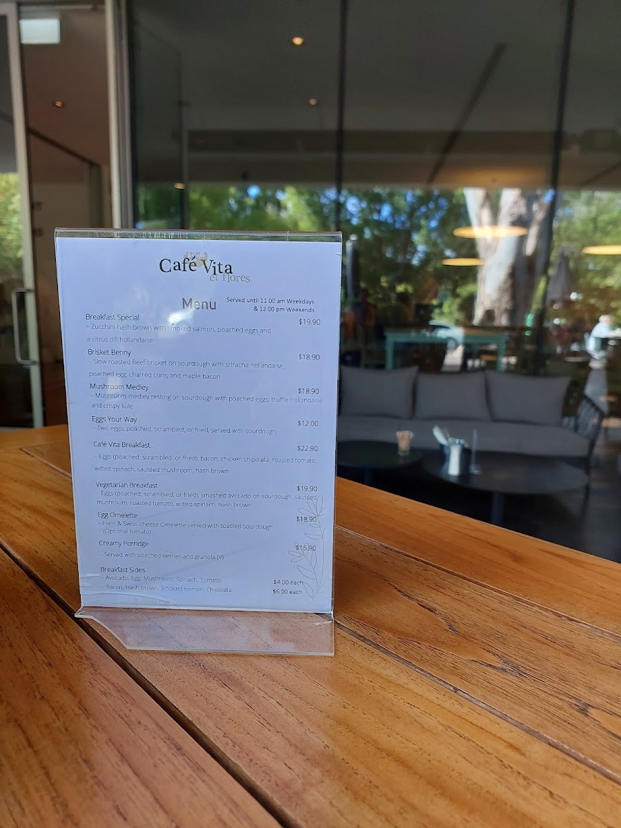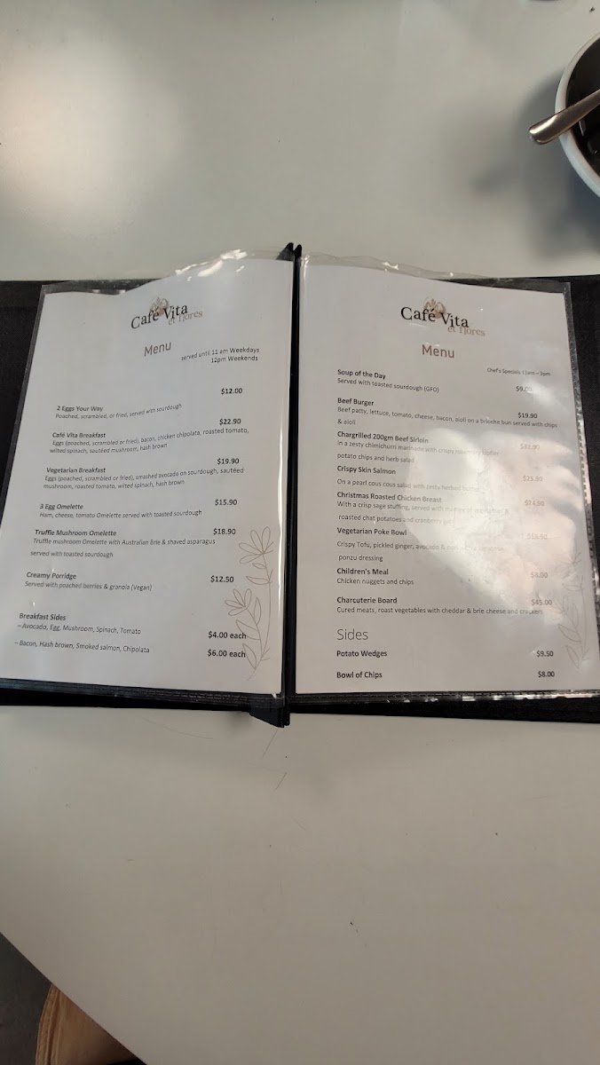 The menu at Café Vita Et Flores - Springvale offers a diverse selection catering to various tastes, making it a perfect spot for any meal of the day. For breakfast, diners can choose from classic options like Eggs Your Way and the hearty Cafe Vita Breakfast, as well as more specialized dishes such as the Vegetarian Breakfast and flavorful Truffled Mushroom Omelette. For sides, Potato Wedges and a Bowl of Chips complement the main dishes. If you're in the mood for something refreshing, the Detox Zing and Firestarter fruit & vegetable smoothies provide a burst of energy, while the indulgent Strawberry Split and Berry Go Round smoothies offer a sweet treat. The chef’s specials bring unique flavors, featuring the Soup of the Day, Tuscan Meatballs, and crispy Arancini. For those seeking something more substantial, the Beef Burger, Chargrilled 200gm Beef Sirloin, and Crispy Skin Salmon are popular choices, with the Christmas Roasted Chicken Breast offering a festive touch. To complement your meal, the wine selection features premium options like French Champagne and Yabby Lake Single Vineyard 2019 Chardonnay, while beer lovers can enjoy favorites such as Crown Lager and Corona. With its wide range of dishes and beverages, Café Vita Et Flores ensures a delightful experience for all who visit.
